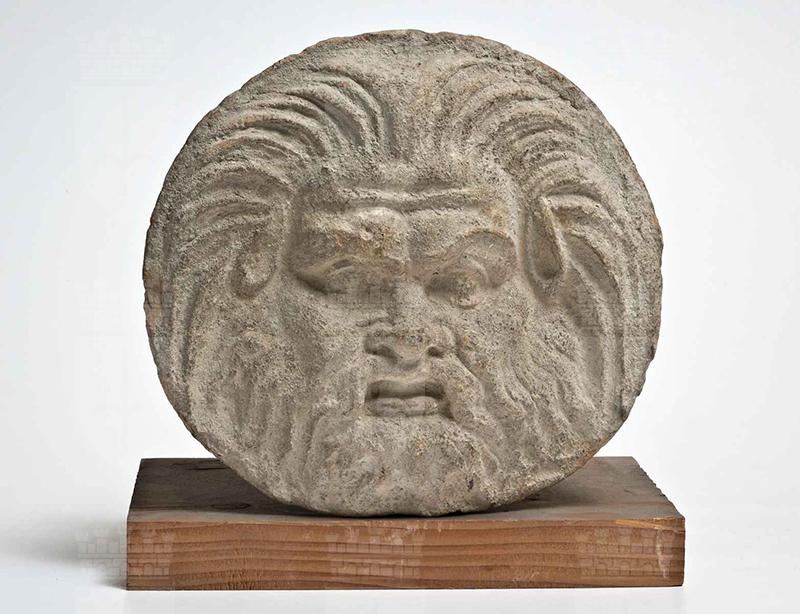 Argilla di color beige, in frattura argilla rosata. A causa delle notevoli somiglianza con l'antefissa inv. 2351 (T.18) sembra provenire dalla medesima matrice. La bocca, dalle labbra carnose, è aperta, gli occhi spalancati, il naso largo e schiacciato, le sopracciglia corrugate, la fronte solcata da due profonde rughe orizzontali; le orecchie equine sono poste all'altezza degli occhi, lunghe ciocche di capelli ai lati del viso che terminano all'altezza delle orecchie, la barba è folta.