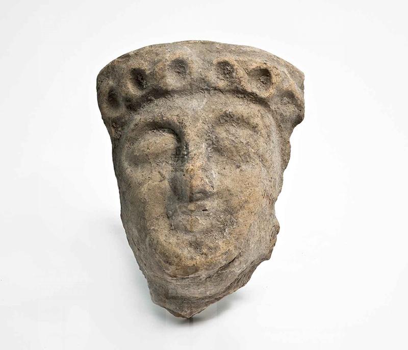 Argilla di color beige, in frattura argilla rosata. Dalla parte posteriore, completamente piatta, soltanto il bordo superiore del pezzo sporge per un breve tratto. Il volto si restringe verso il basso; sulla fronte i capelli sono disposti a piccoli cerchietti; le sopracciglia ad arco si collegano al setto nasale, gli occhi sono sporgenti senza palpebre, la bocca è piccola e appena socchiusa.
