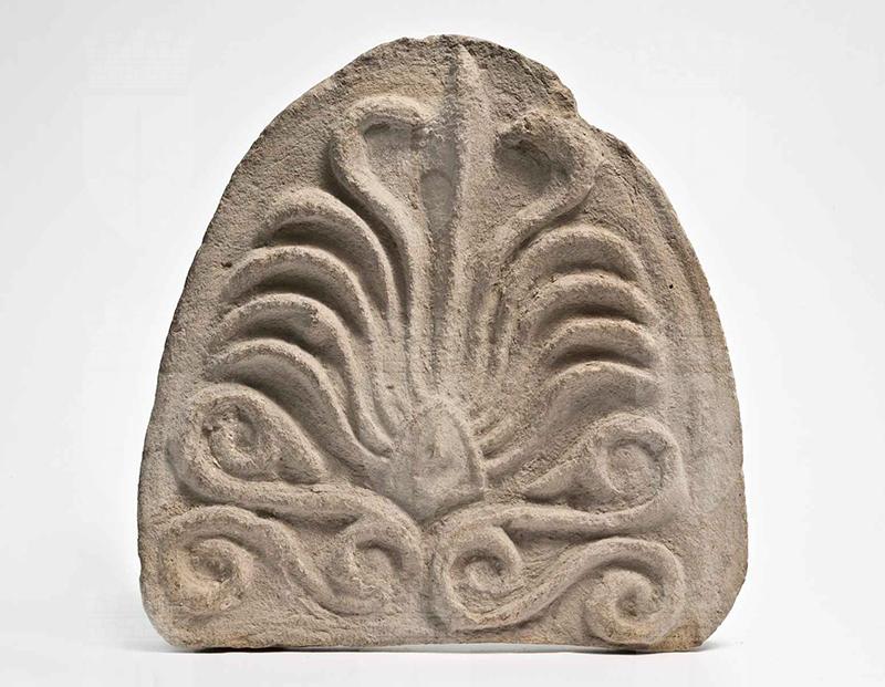 Argilla di color beige chiaro, in frattura argilla beige. Alla base vi sono due elementi terminanti alle estremità in volute, da cui spuntano altri due elementi, che si sviluppano orizzontalmente e terminano in volute, e un triangolo; da questo spuntano undici petali sottili e incavati: il centrale è dritto fino al bordo superiore, i due laterali a questo si curvano verso l'interno, i restanti verso l'esterno.