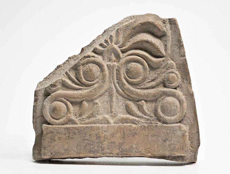 Argilla di color beige, in frattura argilla rosata. Una base in forte rilievo sostiene le doppie volute, dalle quali spunta la palmetta; l'elemento da cui si dipartono i petali è sostenuto da una specie di lungo stelo rigido. Presenta una spessa lastra alla base, le volute contengono un largo bottone, i petali sono piuttosto grossi e con nervatura centrale. Non si conosce l'esatta provenienza del pezzo.