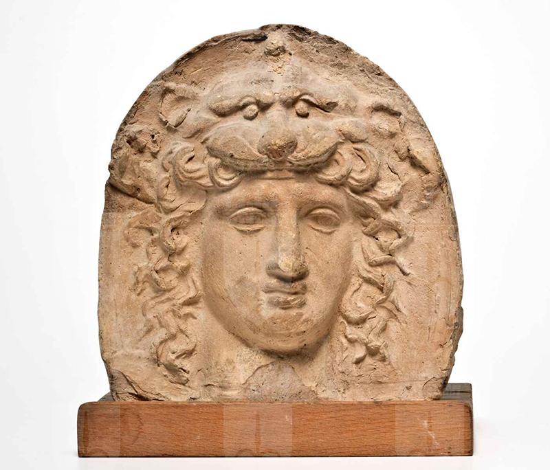 Argilla rosata sia in superficie che in frattura. Probabilmente prodotta dalla matrice creata usando come patrice l'antefissa inv. 3784 (T.491). Il volto, forse femminile, è girato verso destra e presenta un naso piuttosto massiccio, con una bocca piccola e carnosa; gli occhi, quasi chiusi, hanno palpebre spesse e sporgenti. La leonté è abbastanza ampia, mentre le alette sono piccole. Le ciocche dei capelli sono scomposte. .