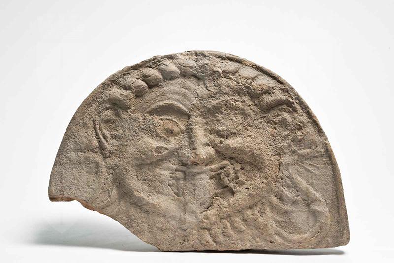 Argilla di color grigio chiaro; in frattura argilla di color arancione. E' rovinata in superficie ed è coperta di incrostazioni, di forma semiellittica. Dalla barba della gorgone spuntaun serpente per lato.