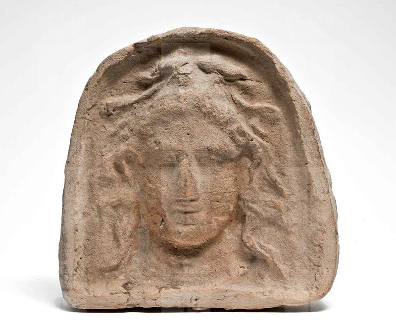 Argilla di color beige chiaro, su mento e parte del collo colore più scuro; in frattura argilla rosata. Si riescono a distinguere solo i tratti principali del volto: il viso è ovale, gli occhi leggermente infossati, il naso dritto, la bocca piccola e socchiusa, le labbra carnose. I capelli sono ondulati e un ciuffo è raccolto in cima alla testa; è rappresentato il collo.