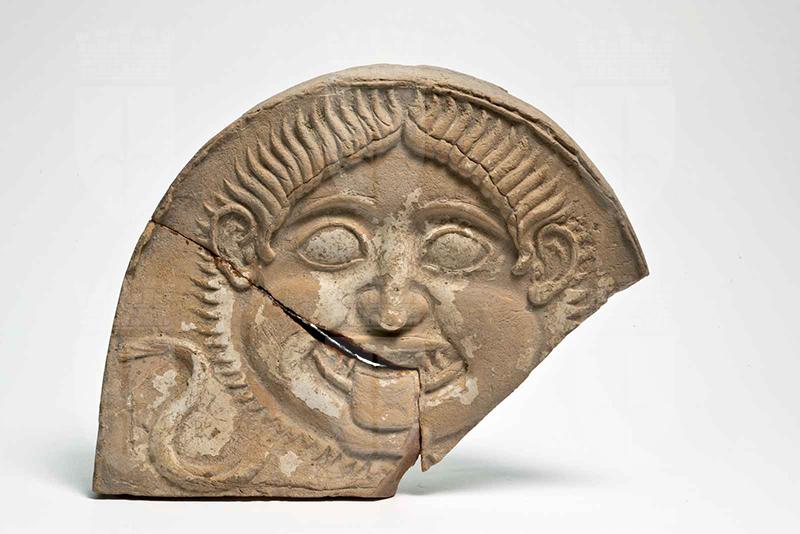 Argilla di color beige chiaro, in frattura color sabbia. Superficie rovinata dalle incrostazioni. Antefissa semiellittica, mancante della parte in basso a destra, con frattura che corre dal bordo sinistro all'altezza dell'orecchio verso la bocca, tagliandola, e scende verticalmente sul lato destro della lingua. E' presente un serpente a sinistra che esce dalla barba.