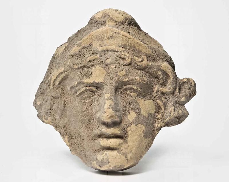 Argilla di color beige, coperta da uno strato marroncino. La figura presenta sulla fronte una specie di diadema; la testa è piuttosto massiccia, i capelli escono ai lati della fronte solcata da una ruga verticale; le palpebre sono ben marcate, l'occhio sinistro è volto leggermente verso il basso, la bocca dischiusa, le labbra carnose.