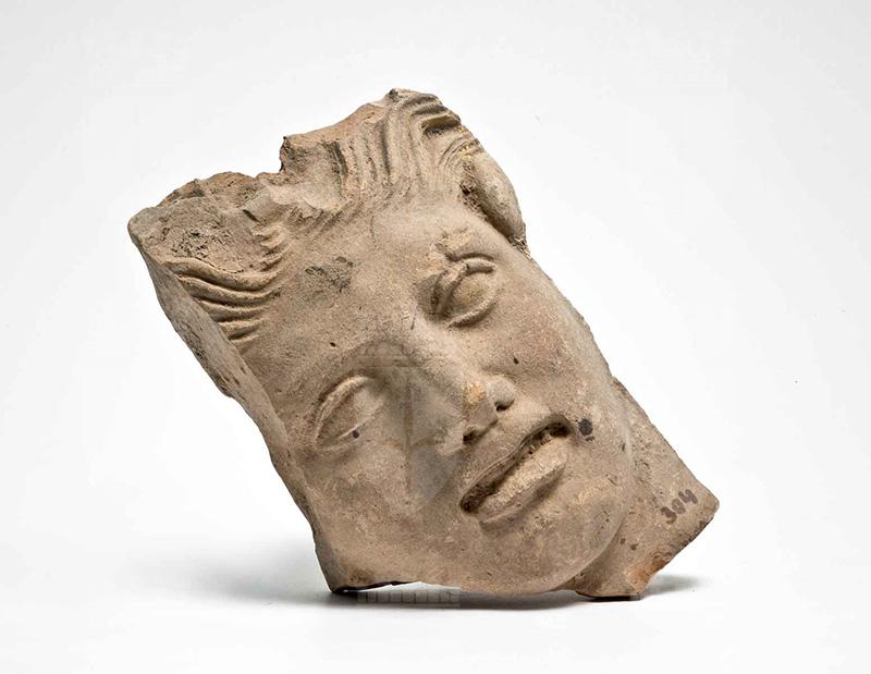 Argilla di color grigio chiaro, in frattura rosata. La forma degli occhi è simile a inv. 3816 (T.6), ma la lieve diversità nella resa della bocca, più larga e meno carnosa, impedisce di ipotizzare un'identità di matrice.