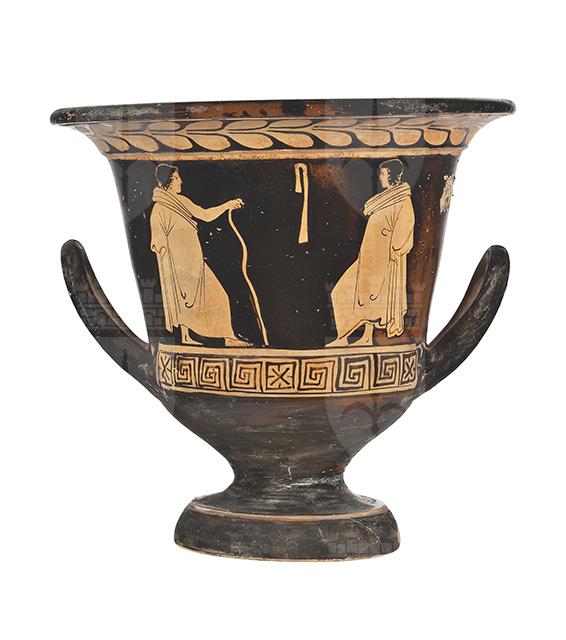 Argilla color camoscio (7.5 YR 6/4 Munsell); vernice lucente, in alcuni punti diluita con qualche scalfittura; arrossamento in vaste zone per un'errata cottura, specialmente sul bordo interno dell'orlo, al centro della scena del cd. lato A e sul piede. Il vaso presenta una larga imboccatura con orlo estroflesso distinto e labbro arrotondato; il corpo svasato poggia su un piede troncoconico con corto stelo. Presenta alte anse a bastoncello, impostate sul ventre e incurvate verso l'alto. Decorazione del lato A: è raffigurata una menade inseguita da un satiro.La menade, con le braccia leggermente piegate, corre verso sinistra guardandosi dietro; porta i capelli raccolti sulla nuca racchiusi da una sottile fascia, è vestita con un lungo chitone coperto da hymathion che svolazza per la corsa. Il satiro, rappresentato nudo con coda ed orecchie equine, corre a sua volta verso sinistra, e sembra spostarsi sulle punte dei piedi, mentre regge con la mano sinistra un elemento vegetale. Decorazione del lato B: sono raffigurati due giovani ammantati a colloquio, ritratti stanti e di profilo, l'uno di fronte all'altro e rivolti verso il centro della scena. Entrambi hanno il baricentro spostato all'indietro con il peso che poggia su una sola gamba, mentre l'altra è leggermente piegata, a riposo. Il giovane a sinistra si appoggia con il braccio destro, libero dall' hymathion, a un bastone. Tra i due, in alto sullo sfondo, una tenia appesa. La decorazione accessoria esterna è costituita, sotto il labbro, da un tralcio di foglie di olivo, incorniciato da due fasce risparmiate, di cui quella superiore è incastonata all'interno di una sottile modanatura. La parte sottostante le scene figurate, inoltre, è arricchita da un meandro interrotto da quadrati in cui sono inscritti una croce di S. Andrea e quattro trattini. Una sottile fascia risparmiata decora il bordo superiore dello spessore del piede. La zona tra gli attacchi delle anse e la parte interna delle anse sono risparmiate. All'interno si notano due fasce risparmiate, di cui la prima - sottile - corre lungo il punto in cui si imposta l'orlo; l'altra, più spessa, si trova all'altezza del punto in cui, sulla parete esterna, comincia la scena figurata.