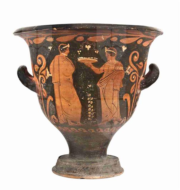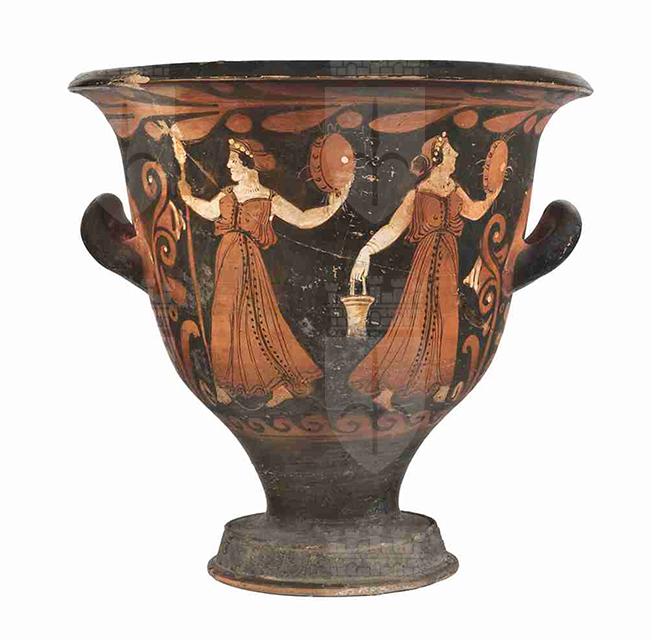 L'imboccatura del vaso è ampia, con orlo estroflesso e labbro marcato da uno spigolo vivo; il corpo è campaniforme e, con un corto stelo, poggia su un piede troncoconico con listello alla base e allo spigolo. Le anse a bastoncello sono impostate orizzontalmente a metà della vasca e incurvate verso l'alto. La vernice nera, tendenzialmente opaca e con diffusi problemi di cottura, copre anche l'interno della vasca del vaso e risparmia l'attaccatura e la parte dietro alle anse; molti dettagli sono resi con sovradipinture bianche e gialle. Il colore dell'argilla oscilla tra Munsell 7.5YR 6/4 (light reddish brown) e 2.5YR 3/6 (dark red). Sul lato A troviamo una scena a tema dionisiaco, con due menadi danzanti: la fanciulla a sinistra è rappresentata con il volto di profilo verso sinistra, con il torso di tre quarti e le gambe in una dinamica posizione di danza, la sini-stra frontale e la destra di profilo; la pelle è resa con sovradipintura bianca. I capelli sono raccolti in un sakkos, da cui esce una ciocca di capelli ricciuti, e sono ornati da un diadema di perle, che si aggiunge agli orecchini con pen-dente in forma di triangolo rovesciato, alla collana, dipinta con semplici trattini paralleli, e ai bracciali. La figura veste un lungo chitone cinto in vita e riccamente pieghettato, decorato con una sottile banda nera verticale, che parte dalla scollatura e arriva ai piedi, tra due file di punti neri: la stoffa leggera fa intravedere le forme del corpo. Entrambe le braccia sono tese: la destra regge un tirso, la sinistra un tamburello. La menade a destra è molto simile all'altra e sostanzialmente simmetrica: il volto è di profilo, il torso di tre quarti con la gamba destra di fronte e la sinistra di profilo. I capelli sono raccolti nel sakkos, ma in questo caso oltre a una ciocca ne esce lo chignon. I gioielli e il chitone sono analoghi a quelli dell'altra menade. Diversi sono gli attributi: il braccio destro, proteso verso il basso, regge una situla, dipinta in giallo a rappresentare il bronzo, mentre il sinistro, leggermente flesso, un tamburello. Una sottile linea ondulata a risparmio segna il piano della scena. Sul lato B compaiono due giovani ammantati: quello a sinistra è completamente di profilo a destra, stante, con la gamba destra leggermente flessa. I capelli sono corti e ricciuti e la testa è ornata da un diadema, in bianco, con un ornamento centrale. L'himation, con pieghe accuratamente segnate e un lungo drappeggio che, dalla spalla, scende fino ai piedi, nasconde completamente le forme del corpo. Il giovane ammantato a destra è stante, ha il volto di profilo, rivolto a sinistra verso l'altro personaggio, il torso di tre quarti, la gamba destra di profilo e la sini-stra frontale, leggermente flessa. Il volto è analogo a quello del giovane a sinistra, ma in questo caso l'himation lascia il torso scoperto fino alla vita, sulla quale ricade con ricche pieghe, retto dalla spalla e dal braccio sinistri. Il braccio destro è teso e regge una phiale con offerte, rappresentate da punti bianchi. Compaiono alcuni dettagli secondari in bianco: in altro alcuni semplici motivi floreali a tre petali (a sinistra, tra le figure e a destra) e due tralci di vite tra le figure; a terra una pianta con fiori a spiga. Le decorazioni accessorie comprendono un tralcio di alloro con bacche, sinistrorso, subito sotto il labbro, un mo-tivo a palmetta da cui si dipartono girali fogliati e fioriti con campanule ai lati delle figure e, in basso, un motivo a onde marine capovolte destrorse; i girali e i fiori hanno dettagli sovradipinti in bianco. Sulla parte superiore dell'orlo sono conservate due etichette, una recante la data di acquisizione da parte del museo «16 febbraio 1904», l'altra con un numero di inventario il cui significato non è interpretabile: «72». L'attuale numero di inventario generale è tracciato a inchiostro rosso nella medesima zona.