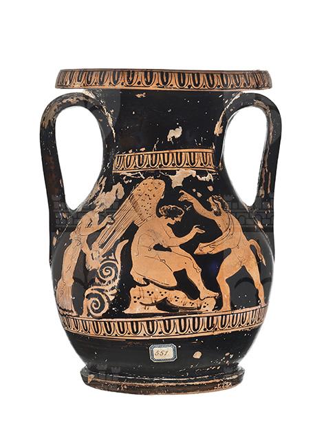 Argilla giallo rossastra (5YR 6/6 Munsell); vernice lucente, di buona qualità, ben conservata ma scalfita e diluita in alcuni punti. Le scalfitture sono presenti su tutte le zone del vaso in maniera omogenea; in particolar modo presso la zona dell'orlo, del collo, delle anse e del piede. Il vaso presenta un corpo piriforme con breve collo a profilo concavo, labbro estroflesso e largo piede a disco. La coppia di anse verticali a nastro è impostata tra spalla e collo. Decorazione del lato A: al centro della scena è raffigurato di prospetto un erote alato seduto. Il piumaggio delle ali è stato reso in modo stilizzato per mezzo di puntini e una fitta fila di trattini verticali nella parte superiore, mentre parte inferiore delle ali è resa con una decorazione a nette linee incise, interrotte soltanto per dare spazio alla mano della donna sulla sinistra. Il supporto su cui è accovacciato l'erote, invece, è costituito da una roccia, il cui materiale è reso da un motivo di tre puntini alternati a doppi trattini verticali. La figura femminile, raffigurata di profilo e vestita con uno stretto chitone drappeggiato, è ritratta nell'atto di reggere forse uno strumento. A destra dell'erote, invece, è raffigurato un satiro barbato danzante, con coda e orecchie equine, che regge un otre con il braccio e la mano sinistra. Decorazione del lato B: sono raffigurati due giovani ammantati, stanti e di profilo, a colloquio. I due sono ritratti uno di fronte all'altro, entrambi rivolti verso il centro della scena. Il giovane a destra porta il peso sulla sola gamba destra, mentre l'altra, il cui polpaccio è lasciato appena scoperto dalla veste, è piegata, a riposo. Tra i due, proprio al centro della scena, è raffigurato un oggetto di forma circolare, forato al centro, identificabile come un altere (peso usato nelle gare di salto in lungo). La decorazione accessoria è costituita da un meandro costituito dalla sequenza ovulo-guscio-puntino, che si ritrova non solo sul labbro, ma anche sopra e sotto le scene figurate. Due sottili filetti graffiti decorano rispettivamente il punto di stacco tra ventre e piede e il bordo superiore dello spessore del piede.