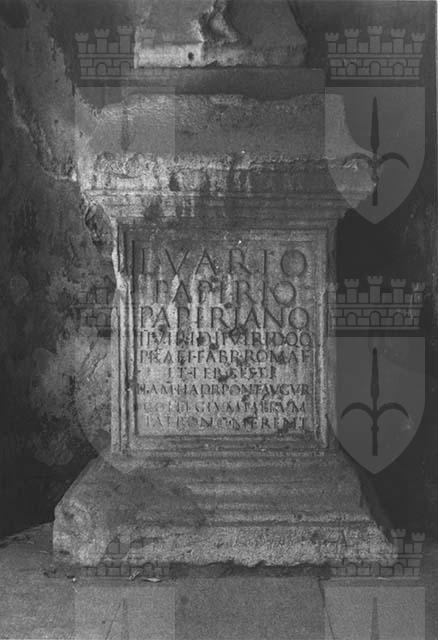 Blocco unico; Dado liscio; Lati incorniciati; Fronte incorniciata e iscritta; Coronamento modanato; Pulvino liscio; Baseo modanata. Proveniente ignota; Rinvenuto prsso la Cattedrale di San Giusto (campanile); Conservato presso l'Orto Lapidario, IV ripiano, risiede oggi nel Lapidario Tergestino, Castello di San Giusto.