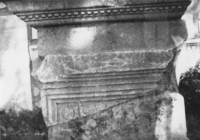 Dado parallelepipedo liscio con fronte incorniciata e iscritta e coronamento modanato. Ara frammentaria con iscrizione latina onoraria in lingua latina di un membro dell'ordine equestre, Q. Baienus Bassianus