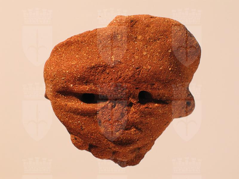 Piccola testa umana dal volto triangolare di stile Usulután, modellata in terracotta rossa non ingobbiata. La figura è priva di alcuni frammenti tra i quali il naso che appare mozzato dall’attaccatura, un orecchio e la parte sinistra della fronte. Da qui è possibile vedere che la testa era in parte cava all’interno. Il personaggio sfoggiava una collana a grosse perle sferiche e un copricapo. Gli occhi sono forati, mentre la fronte appiattita allude probabilmente alla pratica della deformazione cranica che spesso simboleggiava uno status sociale elevato.