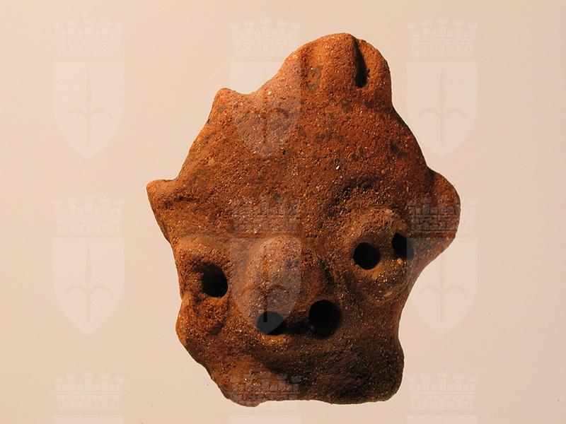 Rappresentazione di un volto umano di stile Usulután reso con tratti schematici. La superficie esterna è in parte annerita. Manca qualche frammento dalla parte superiore della testa. Gli occhi sono due pastiglie ovali sulle quali si notano due coppie di fori. Il naso è reso con una protuberanza sferica sotto la quale altri due fori rappresentano la bocca. La fronte è completamente appiattita e senza soluzione di continuità termina in un bordo frastagliato che allude al copricapo. Sul retro della figura, leggermente concavo, è applicata una presina ad anello.