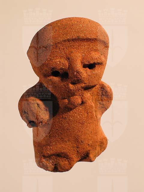 Statuina di terracotta rossa di stile Usulután che rappresenta una figura umana seduta. Il soggetto è privo di braccia e gambe. Le rotture non mostrano contorni netti, dato che si tratta di fratture antiche. La forma del busto è pressoché cilindrica. La testa mostra un viso rotondo con fronte appiattita, probabilmente in accordo a canoni estetici che prevedevano la pratica della deformazione cranica per gli individui di alto rango. Il naso appare in parte scheggiato, gli occhi avevano le palpebre in rilievo mentre l’iride è reso da un foro. La parte posteriore della testa è piatta. Il soggetto indossa un copricapo semicircolare a fascia e una collana composta da elementi sferici. Un piccolo foro è presente sull’orecchio sinistro. La superficie appare oggi priva di ingobbiatura a causa delle abrasioni, ciò rende visibile l’alta percentuale di materiale sgrassante presente nell’impasto. La lavorazione di figurine e testine nell’ambito della produzione fittile Usulután è messa in relazione con la presenza di culti legati alla fertilità e agli antenati.