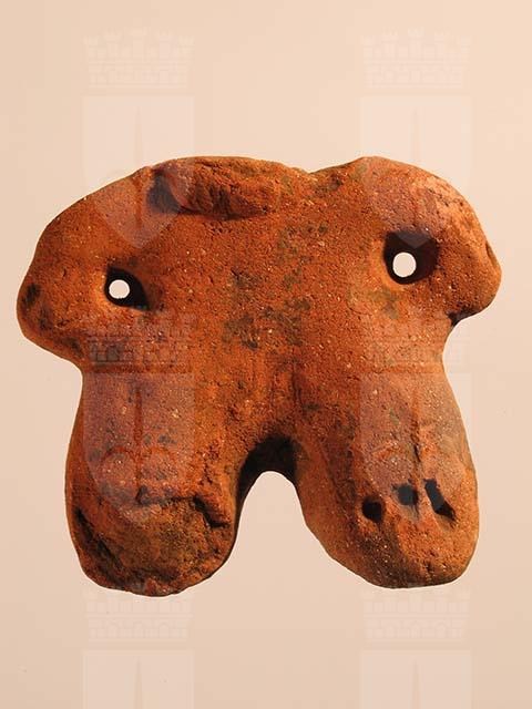 Rappresentazione schematica di stile Usulután di una figura umana in piedi, priva di testa. È stata modellata in pasta di argilla piena e ingobbiata. Le forme del corpo sono sproporzionate: le braccia piccole e corte sono separate dal busto da due fori; le gambe, anch’esse corte e tozze, si allargano verso il basso terminando con tre grossolane scanalature verticali che identificano i piedi. Intorno al collo restano due grani della collana. Sulla superficie si osservano tracce di bruciatura.