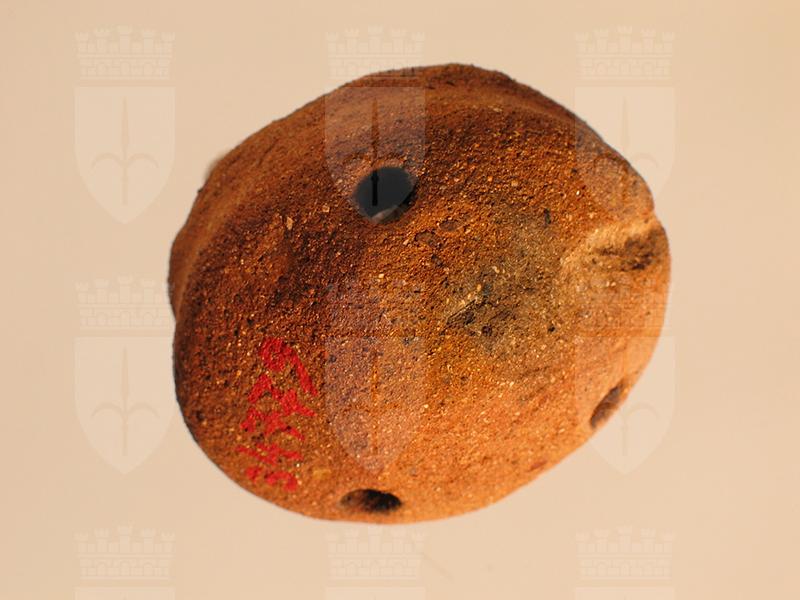 Piccola calotta emisferica di stile Usulután di terracotta, ottenuta con un impasto di argilla rossa mista a materiale sgrassante. La superficie appare ruvida e priva di ingobbiatura. L’interno è cavo e la base aperta. È difficile stabilire con esattezza la funzione dell’oggetto. Potrebbe trattarsi di un’applique, di un piede di vaso o di un sonaglio privo del fondo. Nella parte superiore tre fori. La superficie presenta una scheggiatura e una bruciatura.