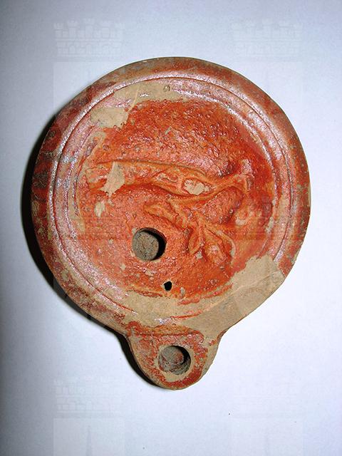 lucerna a disco con becco corto e rotondo, su disco pavone a destra su ramo