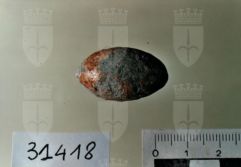 Ghianda anepigrafe, tipo Ic, forma ovoidale con ossidazione ferrosa e ampie abrasioni.