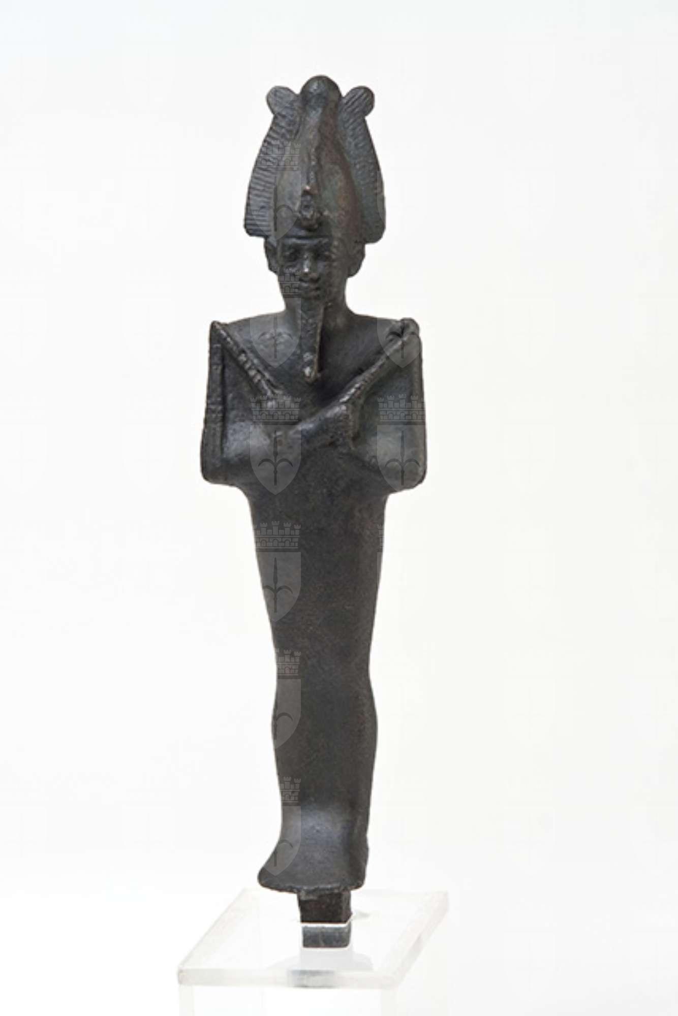 Statuina in bronzo che raffigura il dio Osiride mummiforme con in capo la corona bianca dell'alto Egitto affiancata da due piume di struzzo. Sulla corona dell’Alto Egitto è presente un cobra (l’ureo). Il dio è stante, con la barba divina sul mento e con le mani incrociate sul petto, che reggono lo scettro-heqa nella mano sinistra e il flagello-nekhekh nella destra. Sotto i piedi vi è un perno per l'infissione in una base.