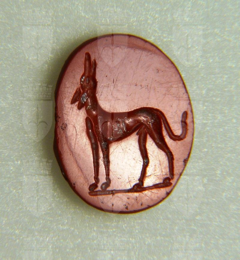 Gemma di forma ovale, piana, inferiormente troncoconica. Cane levriero stante a sinistra con la testa alzata nell'atto di ululare; linea di base.