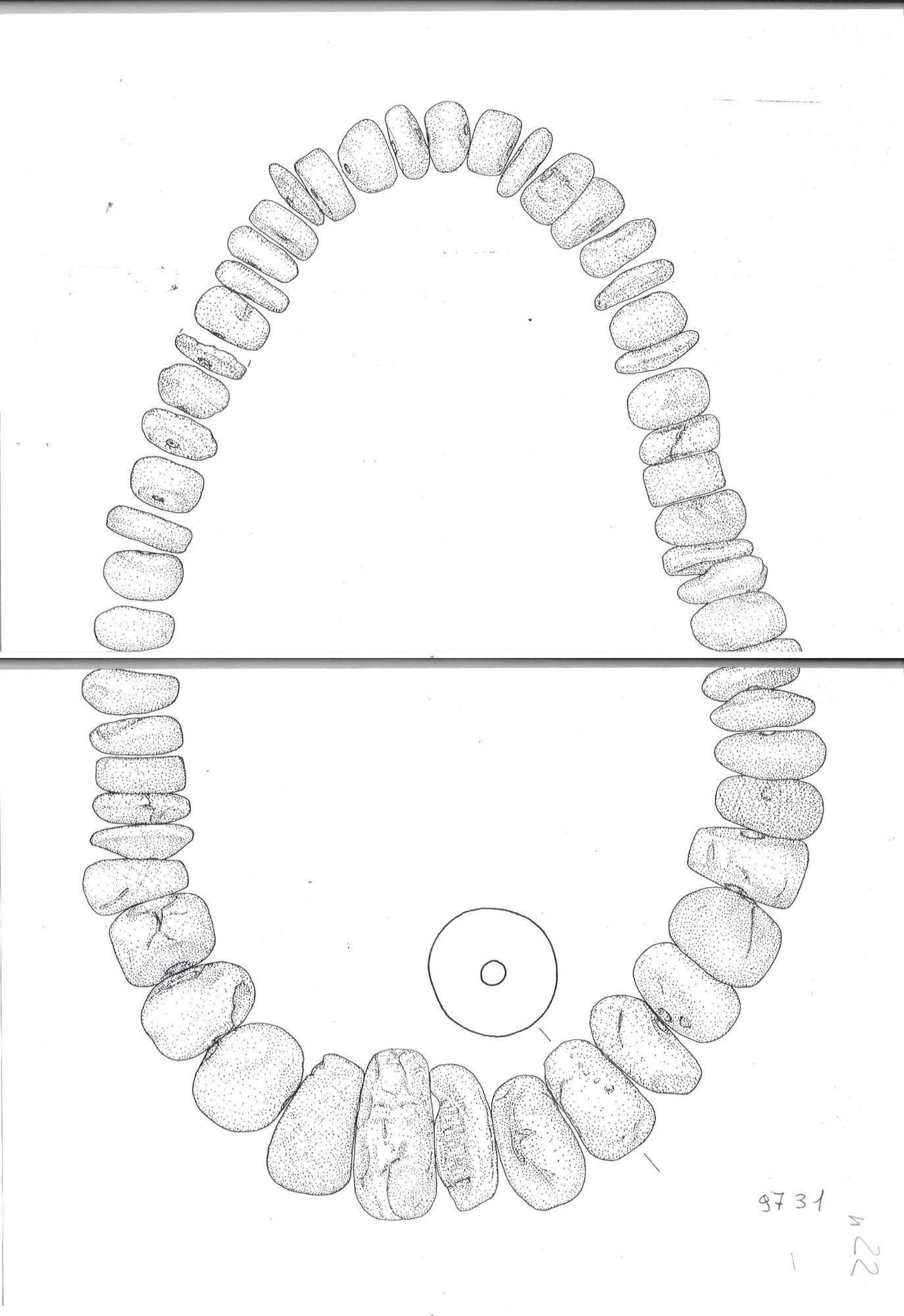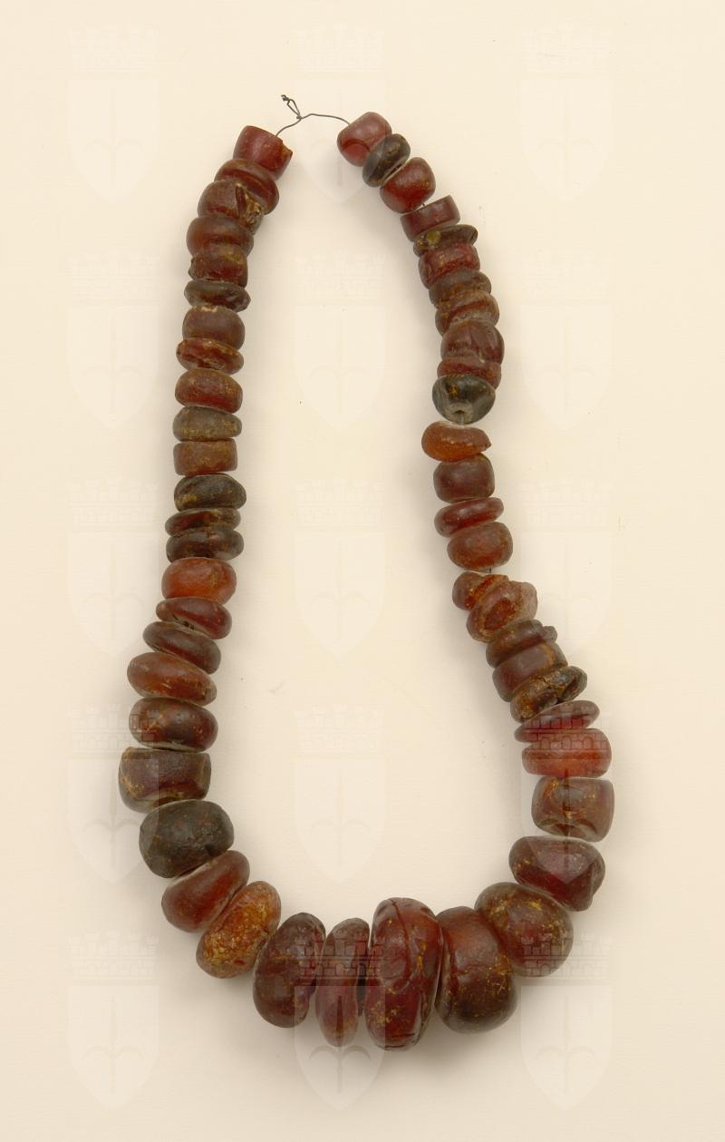 Collana costituita da 52 vaghi d'ambra di dimensioni e forme molto diverse e irregolari (sferica; troncoconica; cilindrica, con estremità a profilo appiattito o arrotondato; discoidale, più o meno ispessita, talvolta con estremità a profilo concavo). Al centro della collana è presente un vago notevolmente più grande degli altri (dim. cm 5,5 x 2,5). L'ambra ha colore rosso bruno, semitrasparente, o bruno scuro, opaco. I fori passanti sono perfettamente circolari e di dimensioni diverse.