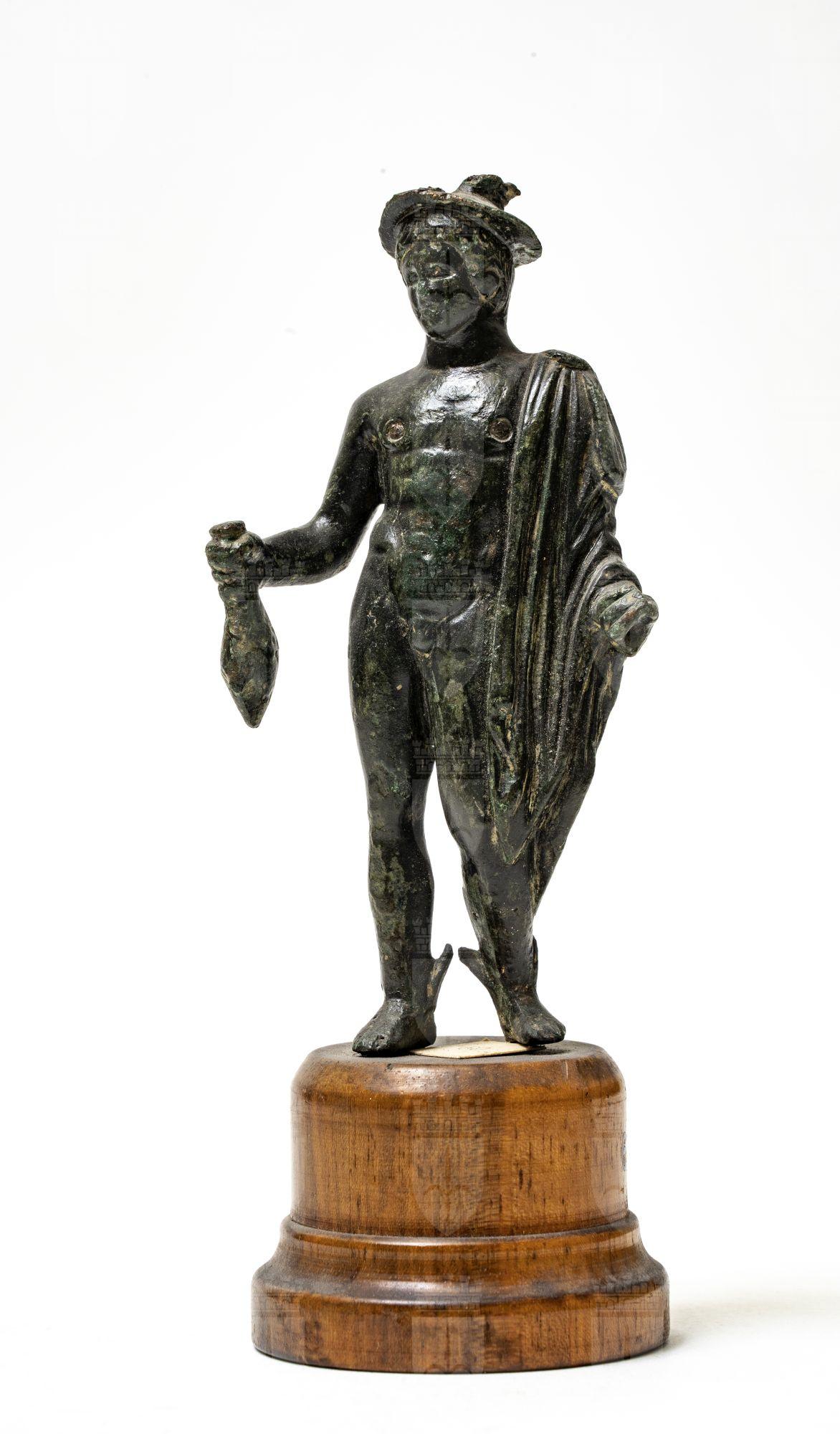Statuetta di Mercurio seminudo: la sua "paenula" è allacciata sulla spalla sinistra ricadendo sul braccio e di lato in drappeggi. I piedi sono alati, la mano destra regge una borsa, sul capo il petaso munito di ali.