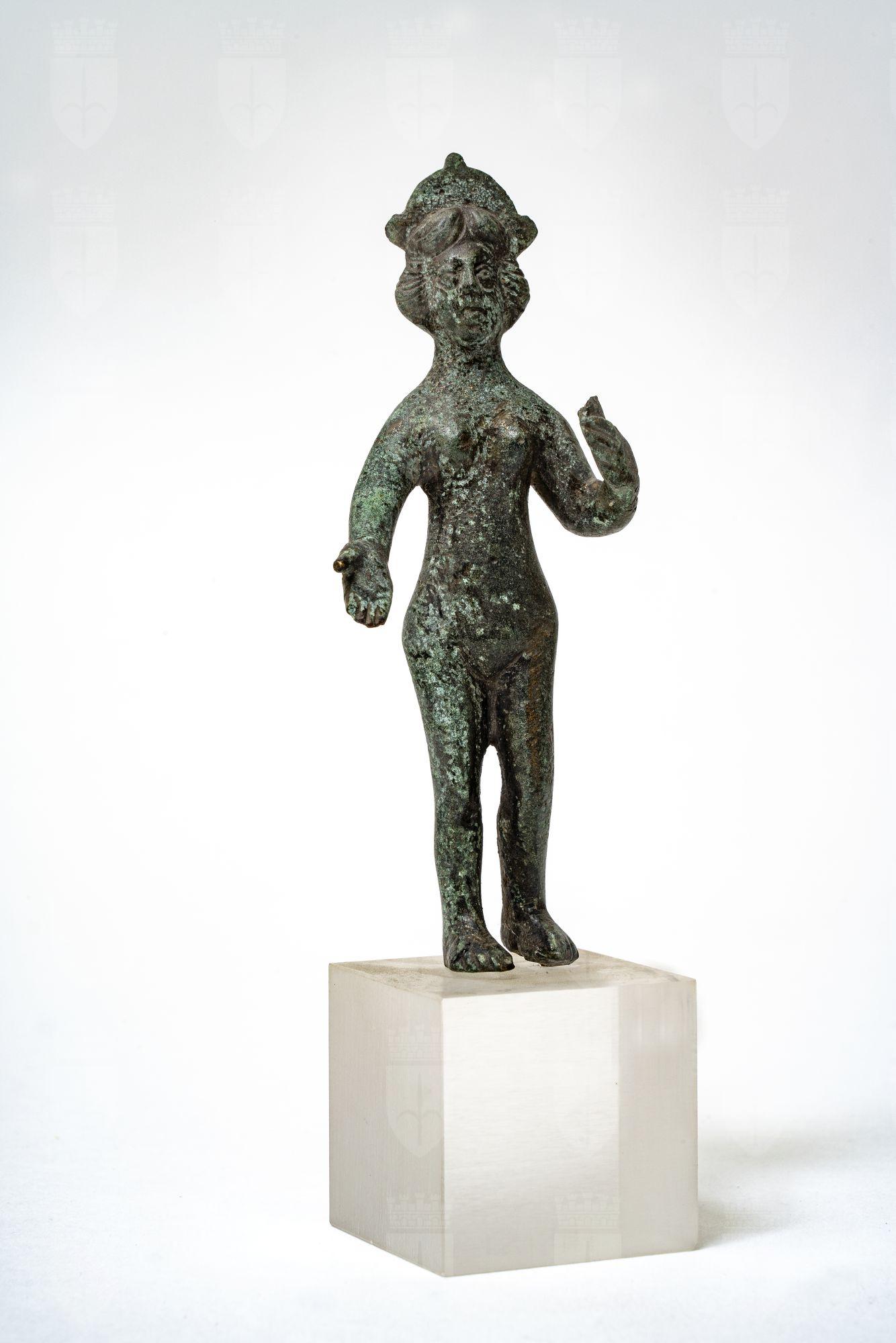 Figurina femminile nuda. Le gambe sono appena divaricate, ha la mano destra protesa a palma in su. La sinistra, col braccio scostato dal busto e piegato, reggeva un oggetto di cui resta la parte impugnata. Il tronco è adornato da due file di puntini impressi, che si incrociano e divergono sul ventre. Il viso si imposta su un collo largo, incorniciato da capelli in due bande sulla fronte, rigonfie ai lati delle guance e riunite in una piccola crocchia sulla nuca, sormontata da diadema a tre lobi.