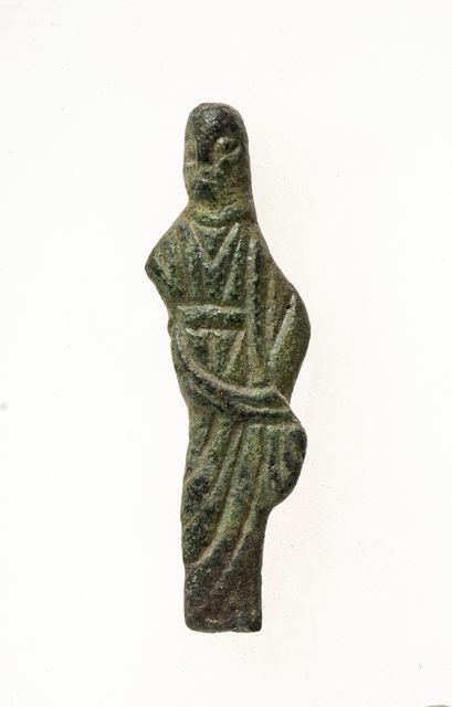 Figurina di donna. Semplicità estrema dei tratti, soprattutto del capo, privo dei capelli e volto deforme. Il pesante pannaggio che ricopre la figura è reso con l'ampio uso di incisioni.
