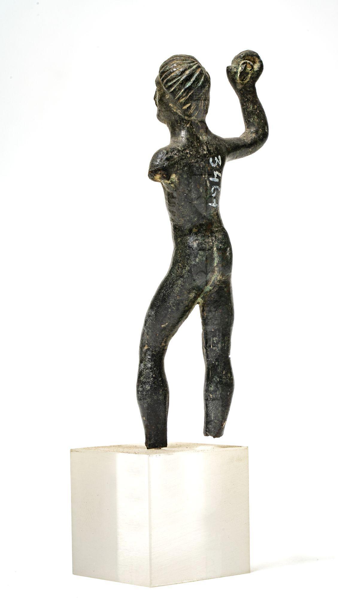 Statuina d'Ercole: il braccio destro è levato con in pugno il manico di una clava. Capelli a calotta e solchi. Fattura rozza, nessun accenno ai tratti anatomici del petto. Patina nera.