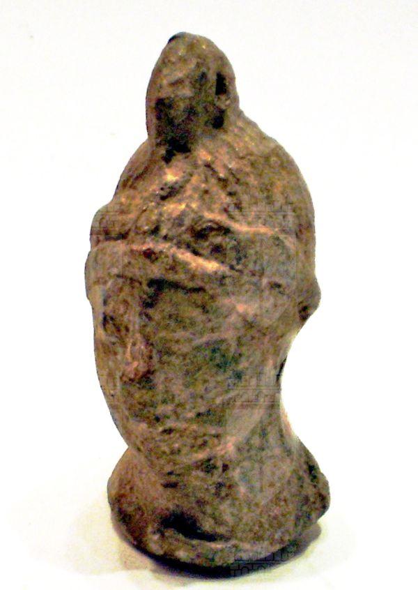 Testina femminile; i capelli formano un doppio cordone intorno al capo. Molto pesante. In alto, sulla testa un anello per appenderla.