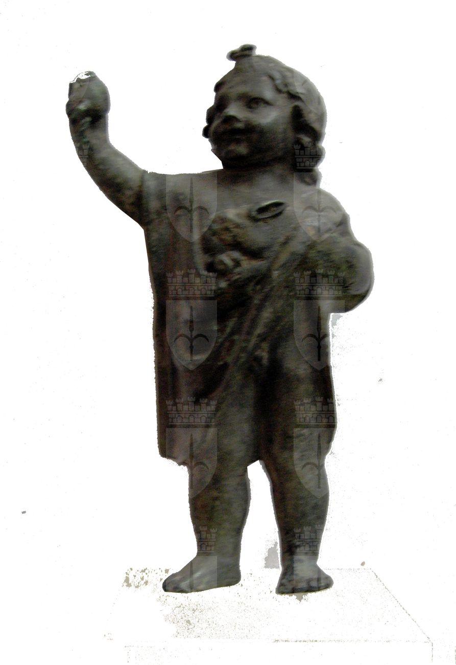Figuretta di putto stante sulle gambe leggermente divaricate che indossa il tipico mantello da viaggio, una paenula. Il braccio è destro alzato con frutto nella mano (forse melagarana) il sinistro, aderente al busto, sostiene un leprotto.