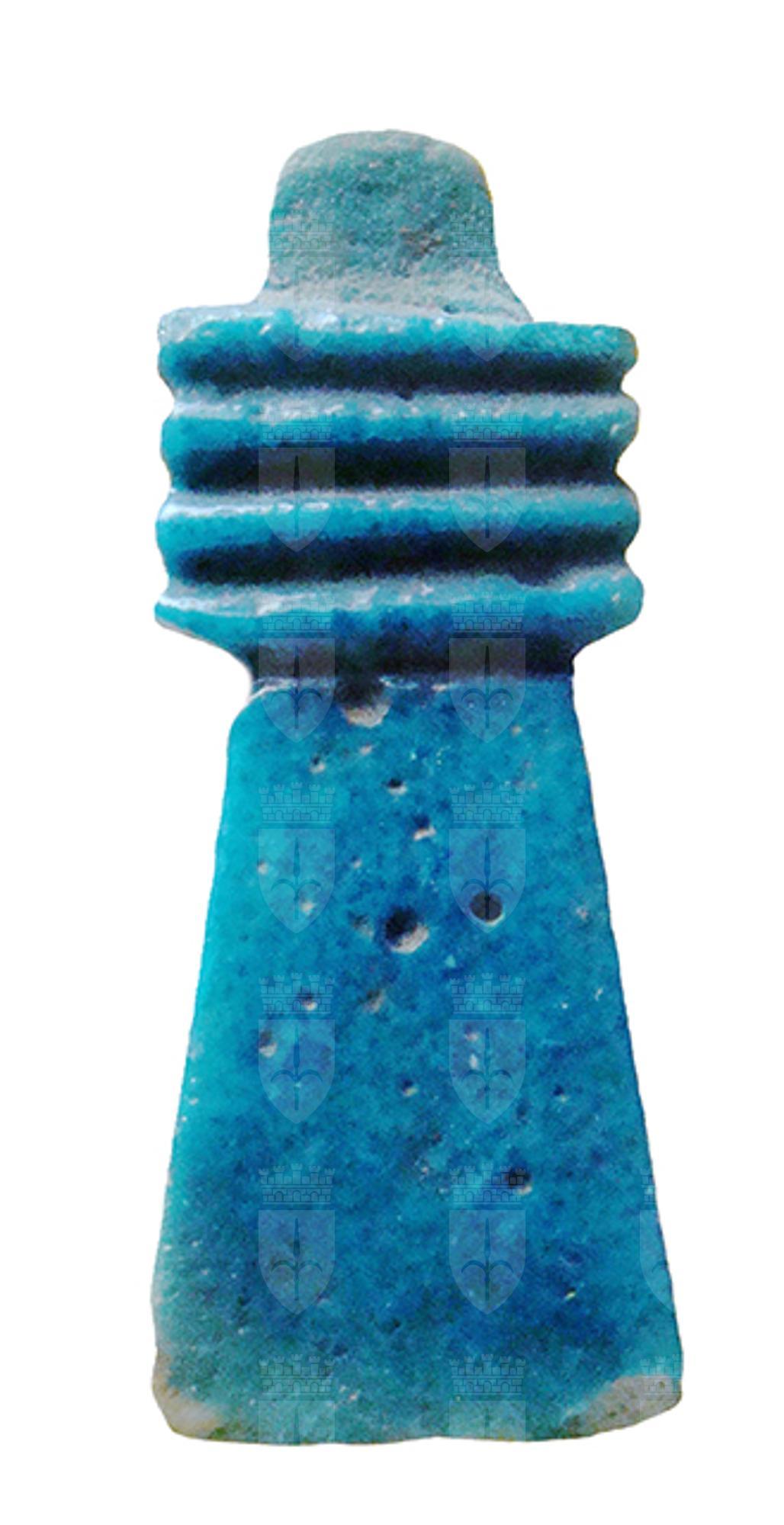 Amuleto che raffigura il geroglifico "djed", a forma di pilastro con quattro espansioni nella parte superiore, che indica stabilità, immutabilità, eternità, resurrezione, ma anche forza inestinguibile ed incorruttibilità. Già nella Prima Dinastia (3150 – 2925 a.C.) era un pilastro intorno al quale venivano legate spighe di grano; dal Nuovo Regno (1543 – 1078 a.C.) fu interpretato anche come spina dorsale di Osiride. Un djed, meglio se in oro, era posto sulla gola del defunto durante il suo funerale, con il compito di farlo divenire uno spirito santificato e perfetto, un seguace di Osiride. Nel capitolo 155 del Libro dei Morti l’amuleto fa sì che “è tua nuovamente la tua spina dorsale e le tue vertebre, così che puoi tornare a muoverti...”.