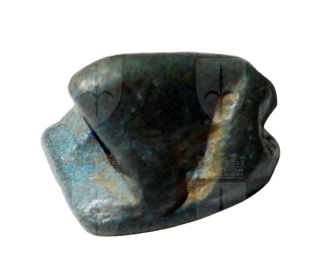 Amuleto in faience con fondo piatto: sul dorso vi è la rappresentazione tridimensionale di una rana, mentre sul fondo è incisa la figura di un babbuino con le zampe anteriori alzate in gesto di preghiera. L'amuleto presenta un foro passante per la sospensione.