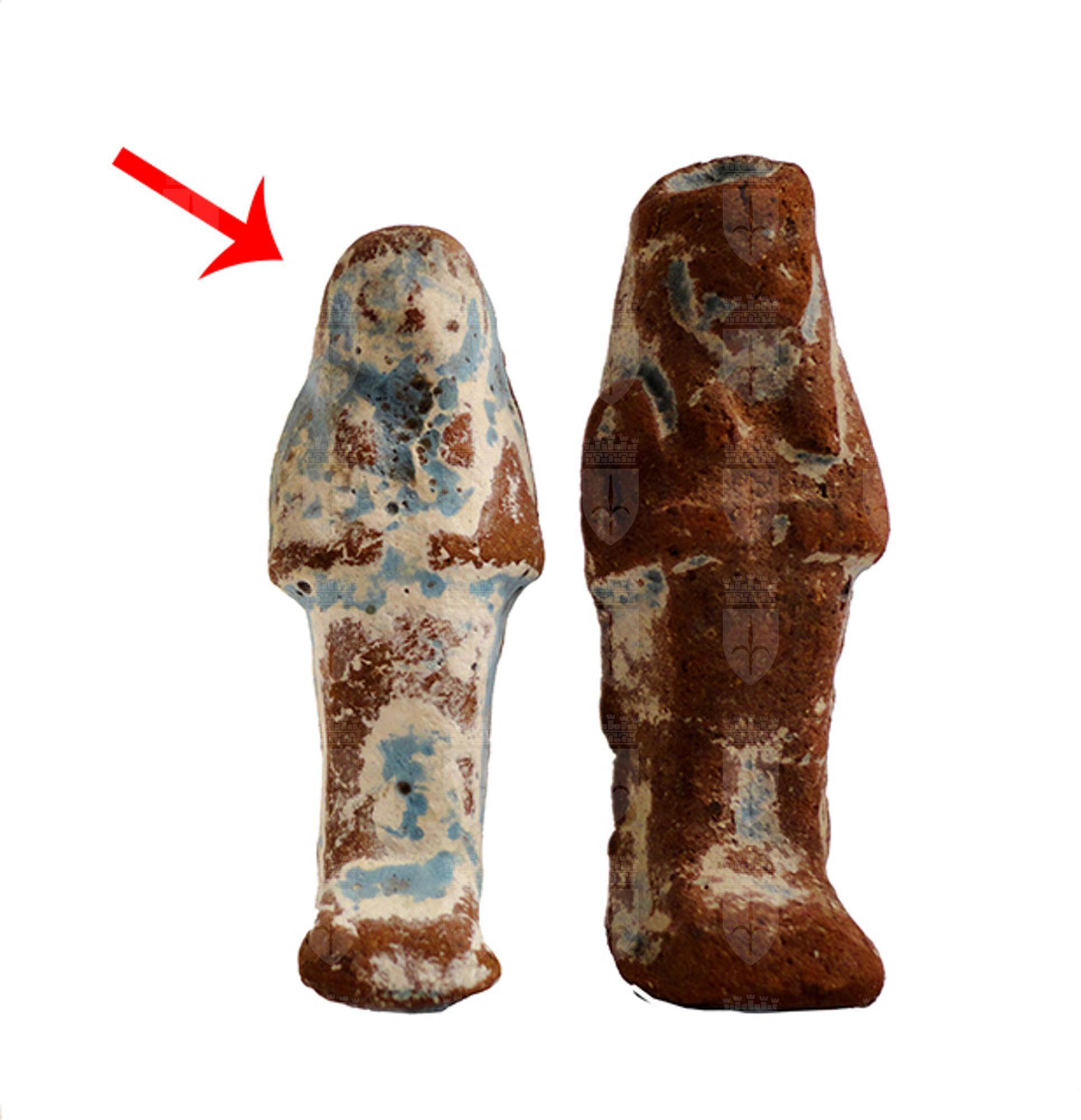 Statuina funeraria mummiforme che indossa una parrucca tripartita. Le mani sono giustapposte, le gambe sono segnate. Il retro è piatto. L’ushabti è privo di iscrizione e serviva verosimilmente come amuleto.