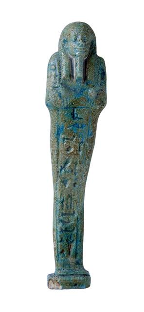 Statuina funeraria mummiforme che indossa una parrucca tripartita, che dietro continua direttamente con il pilastro dorsale, e la barba divina intrecciata. Le mani incrociate tengono ognuna una zappa. Dietro la spalla sinistra pende una sacca. Sotto i piedi è presente una piccola base, che forma un tutt’uno con il pilastro dorsale. L’iscrizione, sul davanti delle gambe, comprende solo il nome del defunto e della madre, scritti in un’unica colonna.