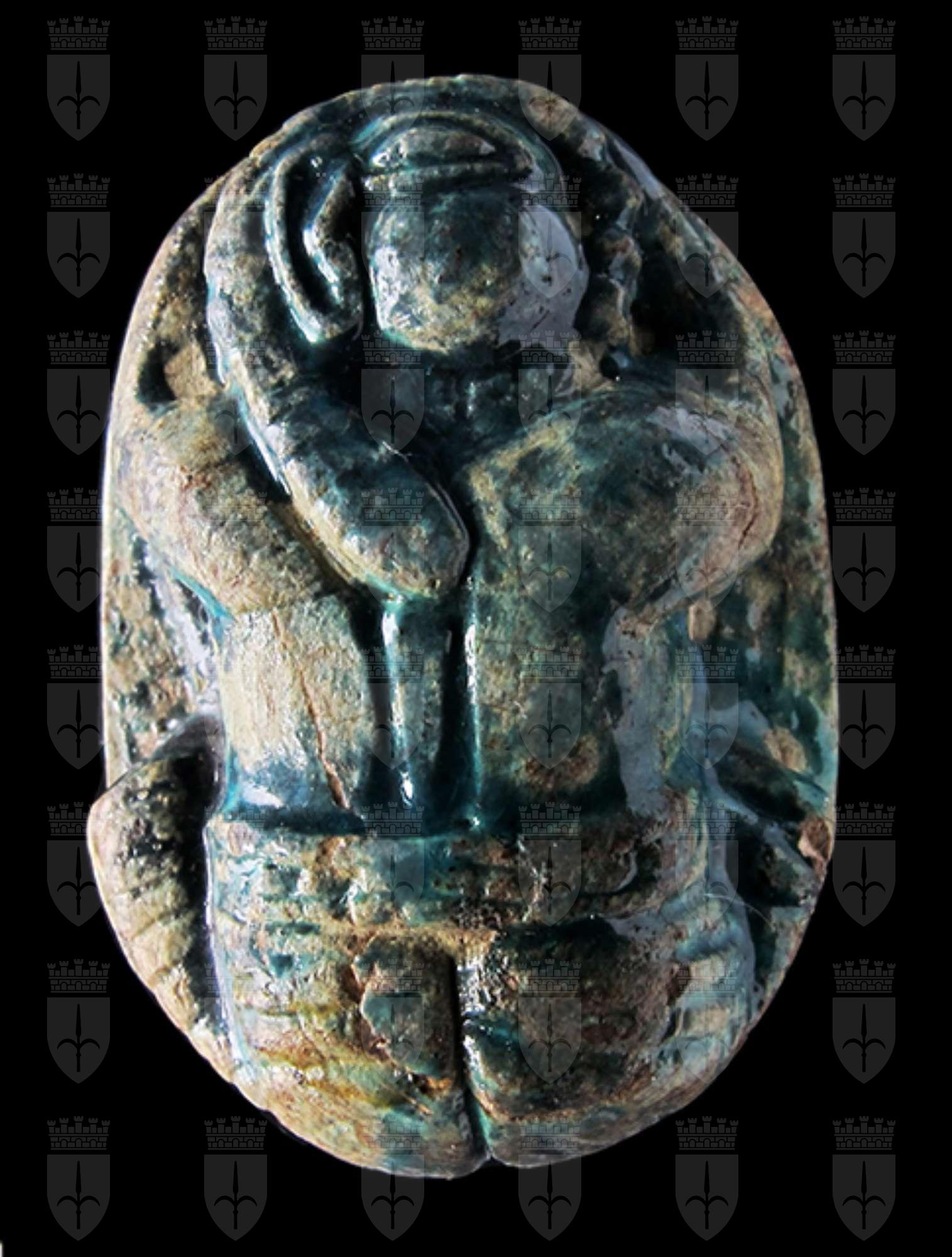 Scaraboide di aspetto alquanto insolito, sul cui ventre si vede una figura umana a testa di sciacallo in piedi davanti al cartiglio in disposizione verticale del prenome del faraone Thutmosi III, Men-kheper-ra. La figura tiene in mano una piuma; della decorazione fanno parte due segni neb, un serpente ed un segno ankh. Il dorso antropomorfo ritrae un uomo accucciato, con la testa girata di lato: si potrebbe interpretare come un prigioniero sottomesso. Foro passante longitudinale.