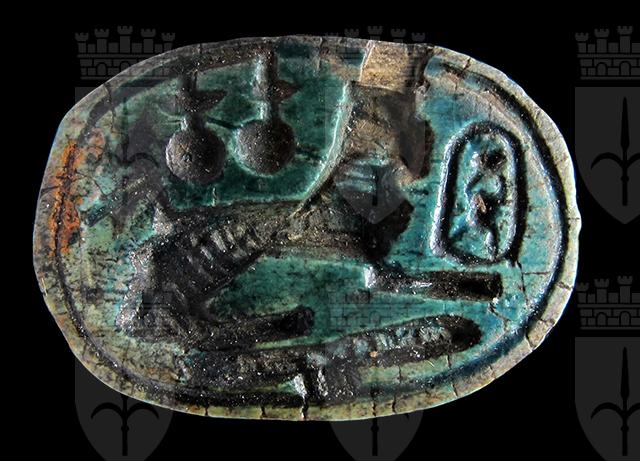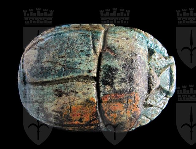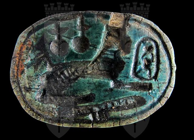 Scarabeo in steatite invetriata turchese con sul ventre, incisione, nel senso della lunghezza dello scarabeo, dell’immagine di una sfinge distesa, che probabilmente indossa una corona, davanti alle cui gambe vi è un cartiglio con i segni dello scarabeo e del sole. Così come è scritto, questo nome non appartiene ad alcun faraone: si tratta probabilmente di un cartiglio pseudo regale. Sopra la schiena della sfinge vi sono due segni nefer. Dorso con clipeo; protorace ed elitre incise. Foro passante longitudinale.