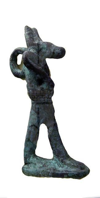 Amuleto in bronzo raffigurante il dio Anubi. Il dio dalla testa di sciacallo è raffigurato in piedi, nell’atto di camminare (con la gamba destra in avanti) e con le braccia stese lungo i fianchi; le mani sono chiuse a pugno. Le orecchie sono molto evidenti, così come il muso canino allungato. Indossa un corto gonnellino. Data la minutezza della figura, i piedi poggiano su una piccola base parallelepipeda, mentre dietro al collo vi è un anello di sospensione.