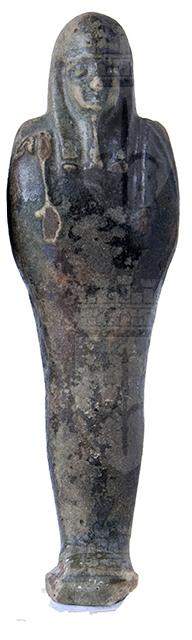 Statuina funeraria mummiforme annerita, forse per effetto del fuoco. Indossa una parrucca tripartita e la barba divina. Le mani sono incrociate ed affiancate, appena accennate: la destra tiene una zappa e la sinistra un piccone. Dalla spalla sinistra pende una sacca. Il pilastro dorsale è presente ed i piedi poggiano su una piccola base. L'ushabti è privo di iscrizione.