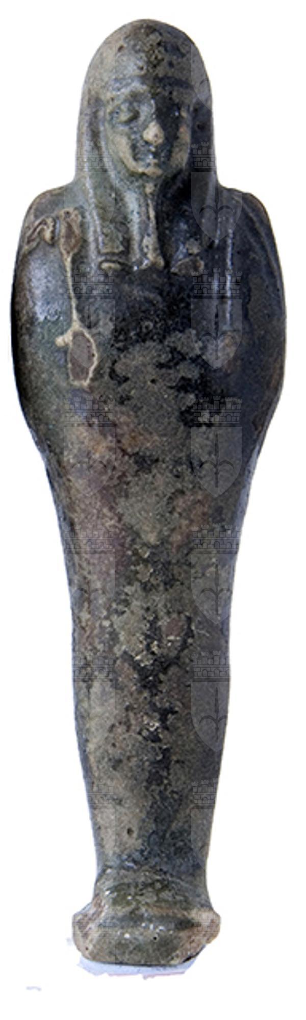 Statuina funeraria mummiforme annerita, forse per effetto del fuoco. Indossa una parrucca tripartita e la barba divina. Le mani sono incrociate ed affiancate, appena accennate: la destra tiene una zappa e la sinistra un piccone. Dalla spalla sinistra pende una sacca. Il pilastro dorsale è presente ed i piedi poggiano su una piccola base. L'ushabti è privo di iscrizione.