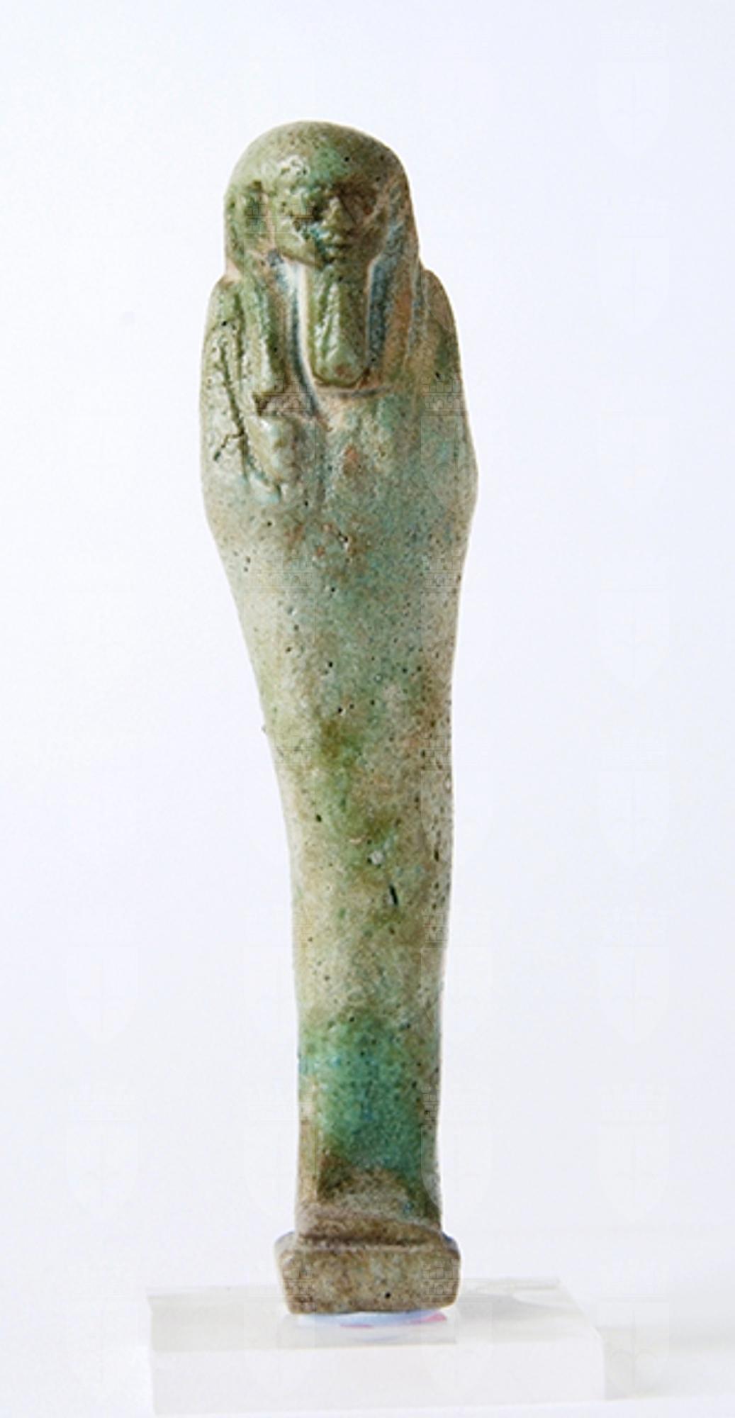 Statuina funeraria mummiforme che indossa una parrucca tripartita, la quale continua dietro direttamente con il pilastro dorsale e con la piccola base, e la barba divina. Le mani incrociate tengono a sinistra una zappa e a destra un piccone. Dalla spalla sinistra pende una sacca. I piedi sono appena accennati. L'iscrizione è disposta in colonna sul pilastro dorsale.