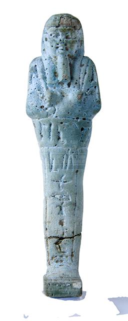 Statuina funeraria mummiforme che indossa una parrucca tripartita e la barba divina. Le mani incrociate e affiancate portano la destra una zappa e la sinistra un piccone. Dalla spalla sinistra pende una sacca. Il pilastro dorsale è presente e forma un tutt’uno con la piccola base. L’iscrizione frontale è a forma di T.