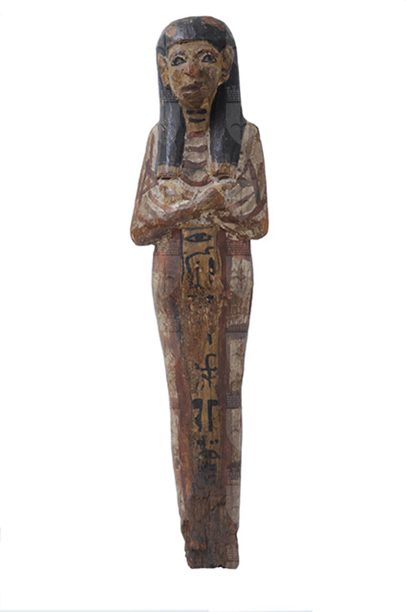 Statuina funeraria mummiforme dipinta in bianco, i dettagli sono stati aggiunti in rosso scuro, blu e nero. Indossa un collare rosso ed una parrucca tripartita nera, con le tre ciocche chiuse da fermagli dipinti in giallo. Le braccia sono incrociate e le mani tengono ognuna una zappa disegnata in rosso. Al centro della schiena vi è una sacca trapezoidale rossa, tenuta da due bretelle, e forse un sacchetto per semi dietro la spalla destra. Le gambe sono decorate con un motivo di bande rosse e blu, imitanti la fasciatura delle mummie dell’epoca. I piedi sono mancanti. L’iscrizione, dipinta in nero, è disposta su una colonna che si legge da destra a sinistra e che è inserita in un pannello ocra con contorni rossi, sul davanti delle gambe.