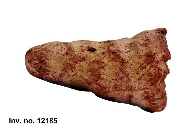 Il cono, con asse non perpendicolare alla base e vertice arrotondato, mostra evidente la forma anatomica della mano dell’artigiano e conserva tracce di ingobbiatura color crema. La base presenta due uomini inginocchiati affrontati in atto di adorazione, sotto una barca divina con due colonne di testo frapposte, completamente illeggibili. Le figure sono in rilievo (alto in media 2 mm) in un campo quadrato ribassato che l’artigiano ha impresso con forza, in modo che le quattro sezioni di cerchio, delimitate dalla circonferenza e dai quattro lati del campo, risultano in rilievo, irregolari e poco curate.