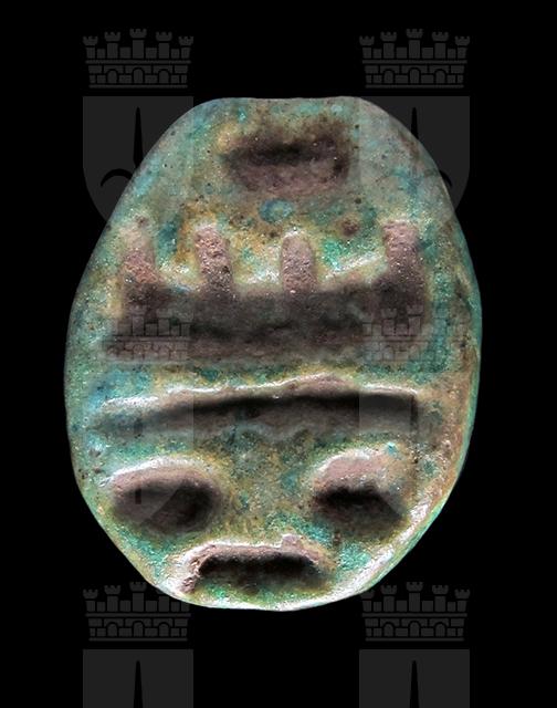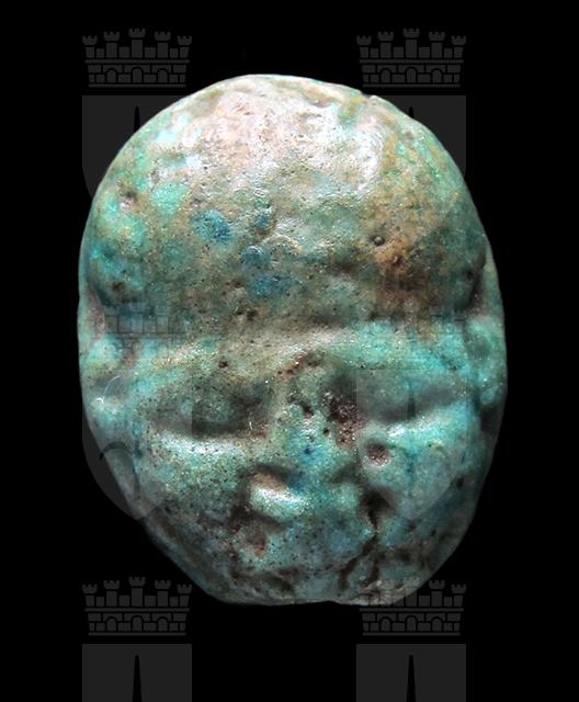 Scaraboide in steatite invetriata azzurra, con sul ventre ncisione della grafia difettiva del nome di Amon-Ra. Dorso a forma di testa umana dai lineamenti negroidi. La decorazione del ventre e del dorso sono capovolte l’una rispetto all’altra. Foro passante longitudinale.