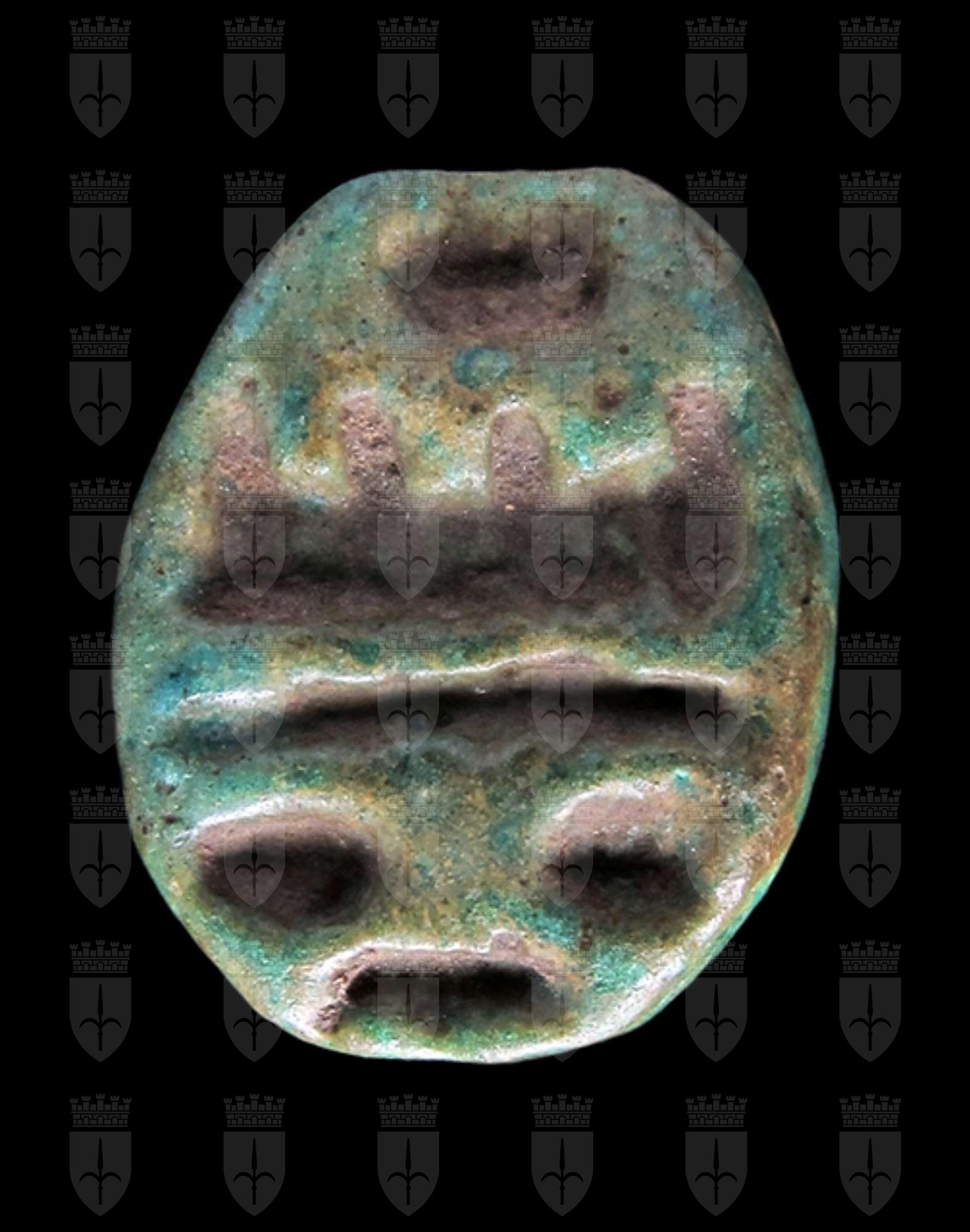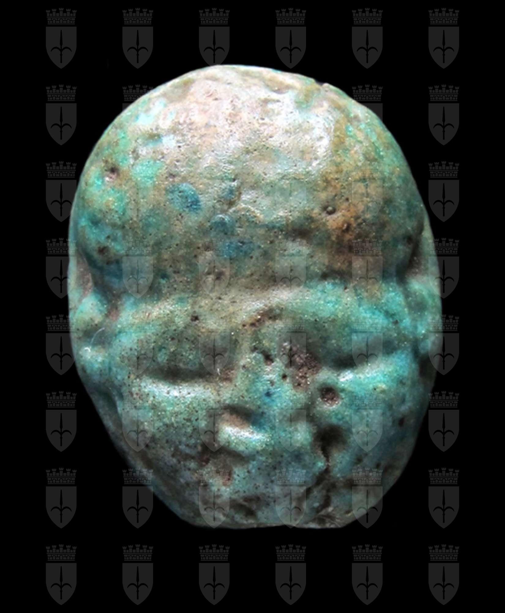 Scaraboide in steatite invetriata azzurra, con sul ventre ncisione della grafia difettiva del nome di Amon-Ra. Dorso a forma di testa umana dai lineamenti negroidi. La decorazione del ventre e del dorso sono capovolte l’una rispetto all’altra. Foro passante longitudinale.
