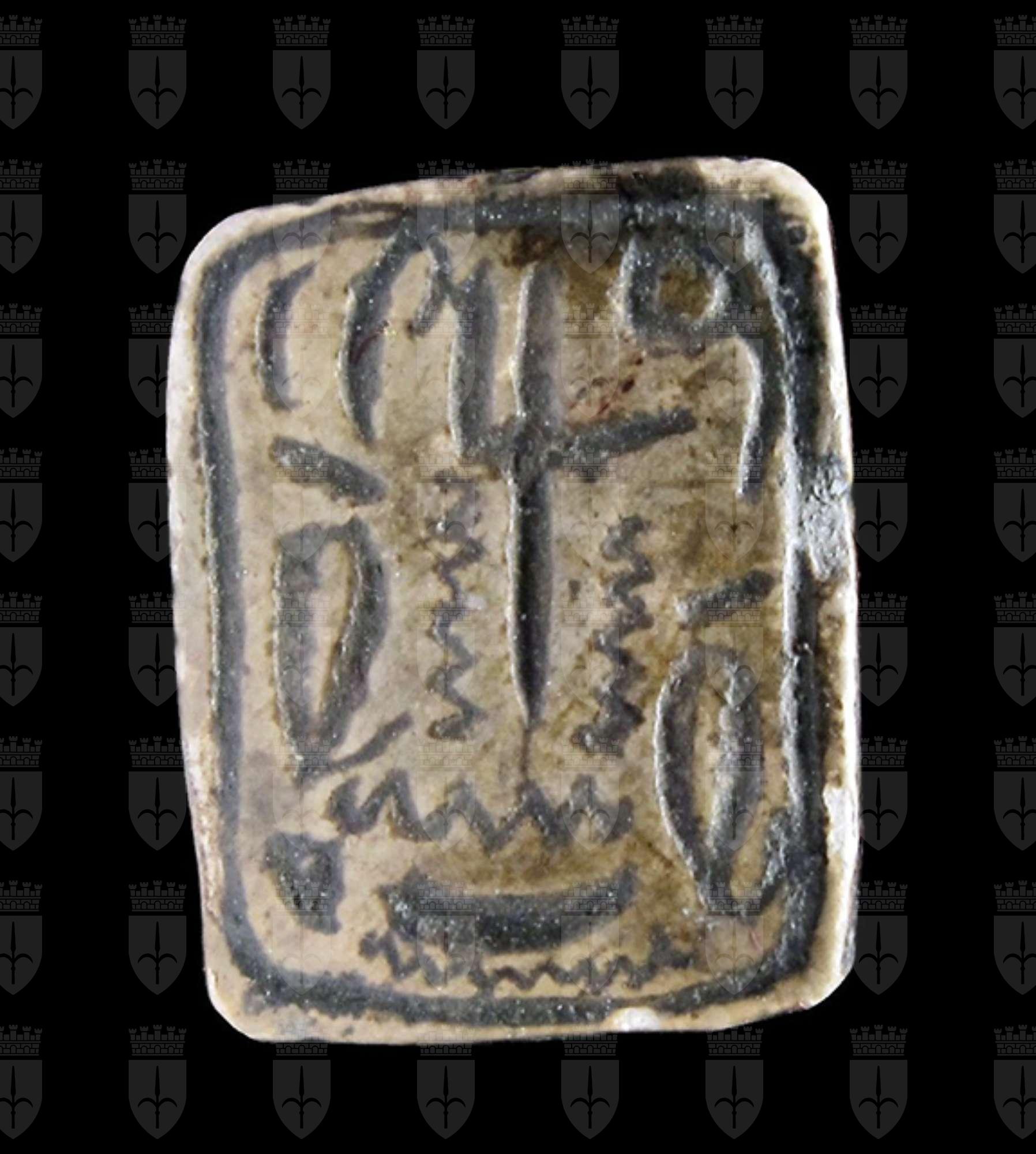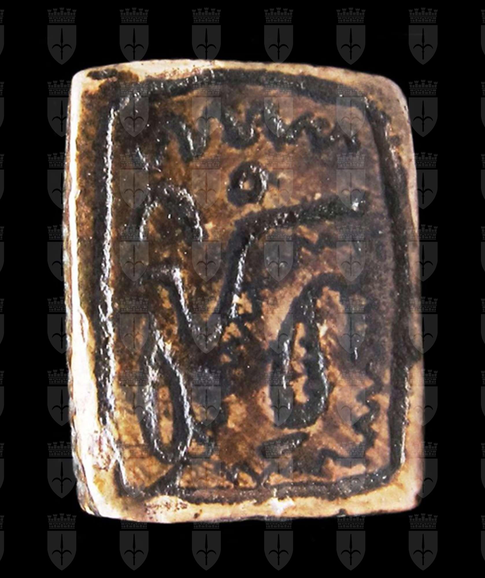 Piastra rettangolare in steatite marrone; su entrambe le facce sono presenti incisioni di segni geroglifici stilizzati, disposti senza un ordine apparente, il che non ne consente la lettura. Sono presenti delle serpentine come riempitivo. Foro passante longitudinale. Autenticità dubbia.