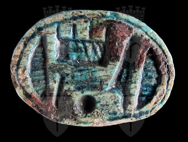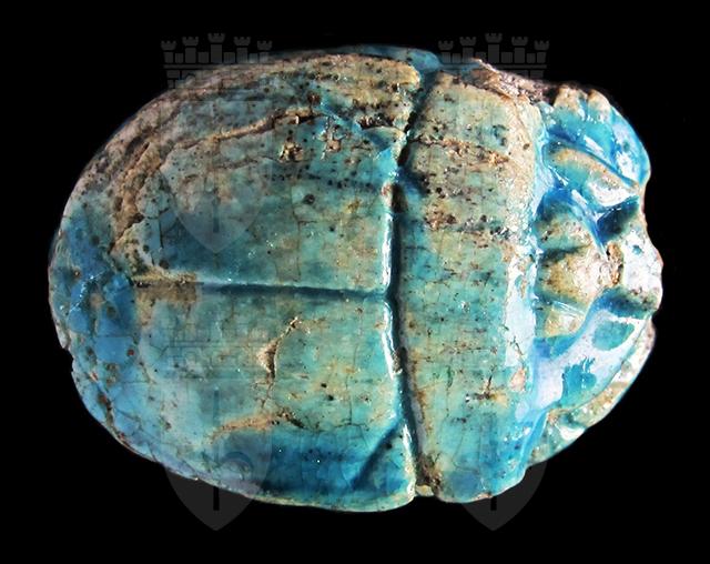 Scarabeo in steatite invetriata turchese con sul ventre incisione del nome di Amon-Ra tra due segni neb, disposto orizzontalmente. Dorso con clipeo, incisione a T che separa protorace ed elitre, le quali presentano piccole tacche a V. Foro passante longitudinale.