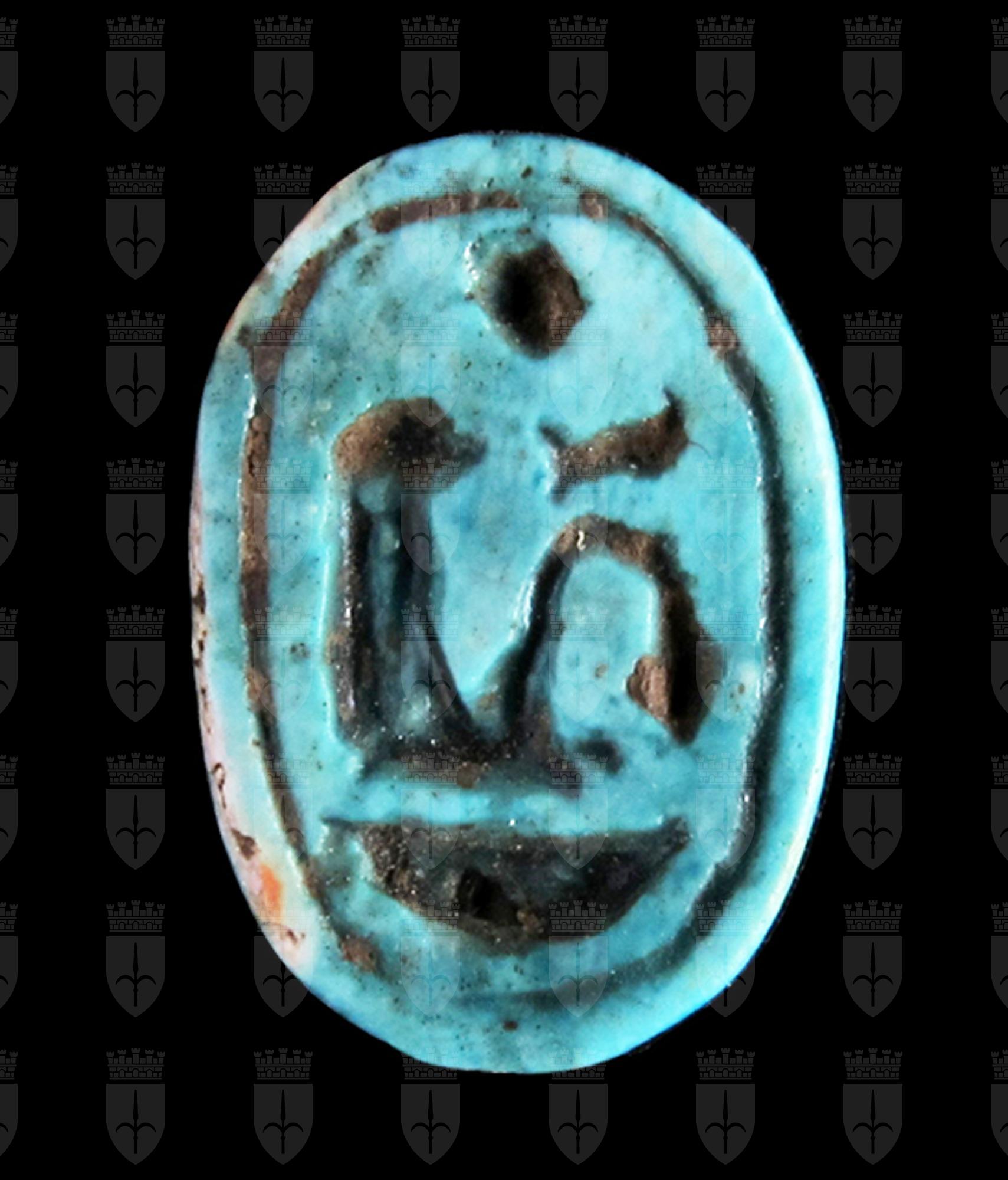 Scaraboide in steatite invetriata turchese con sul ventre una incisione che imita il nome Neb-maat-ra. Sul dorso un motivo centrale a croce dà origine ad una lavorazione geometrica. Foro passante longitudinale.