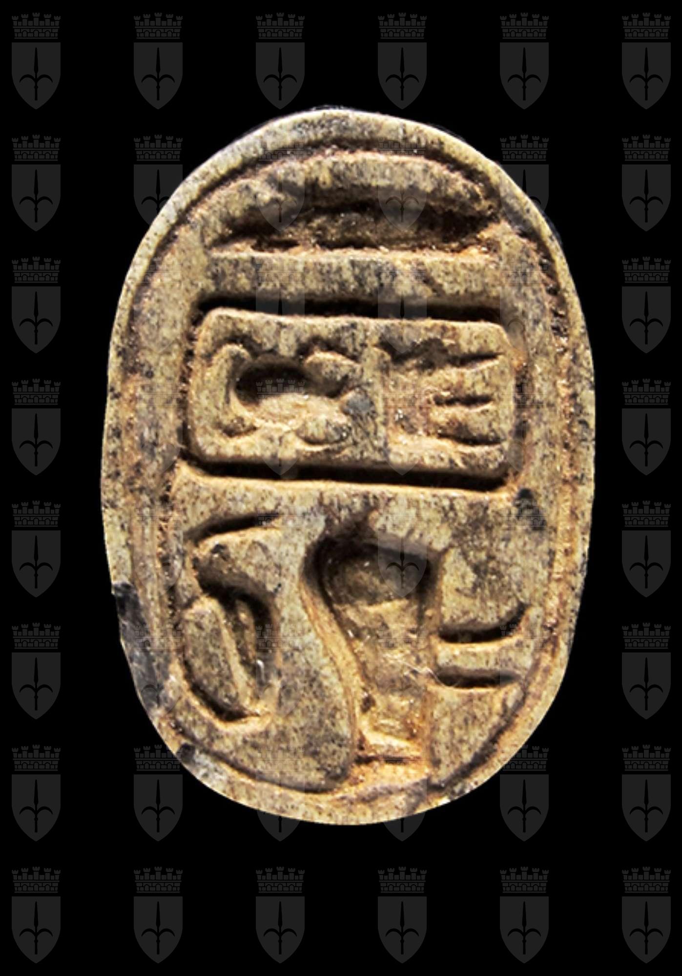 Scarabeo in steatite marrone; sul ventre, sotto un segno neb rovesciato si vede uno pseudo cartiglio imitante quelli col prenome di Thutmosi III in disposizione orizzontale, dal quale pende a sinistra un ureo. Davanti a questo vi è un falco molto stilizzato disposto perpendicolarmente rispetto al resto della decorazione. Dorso con clipeo; protorace ed elitre separati da incisione a T. Foro passante longitudinale.